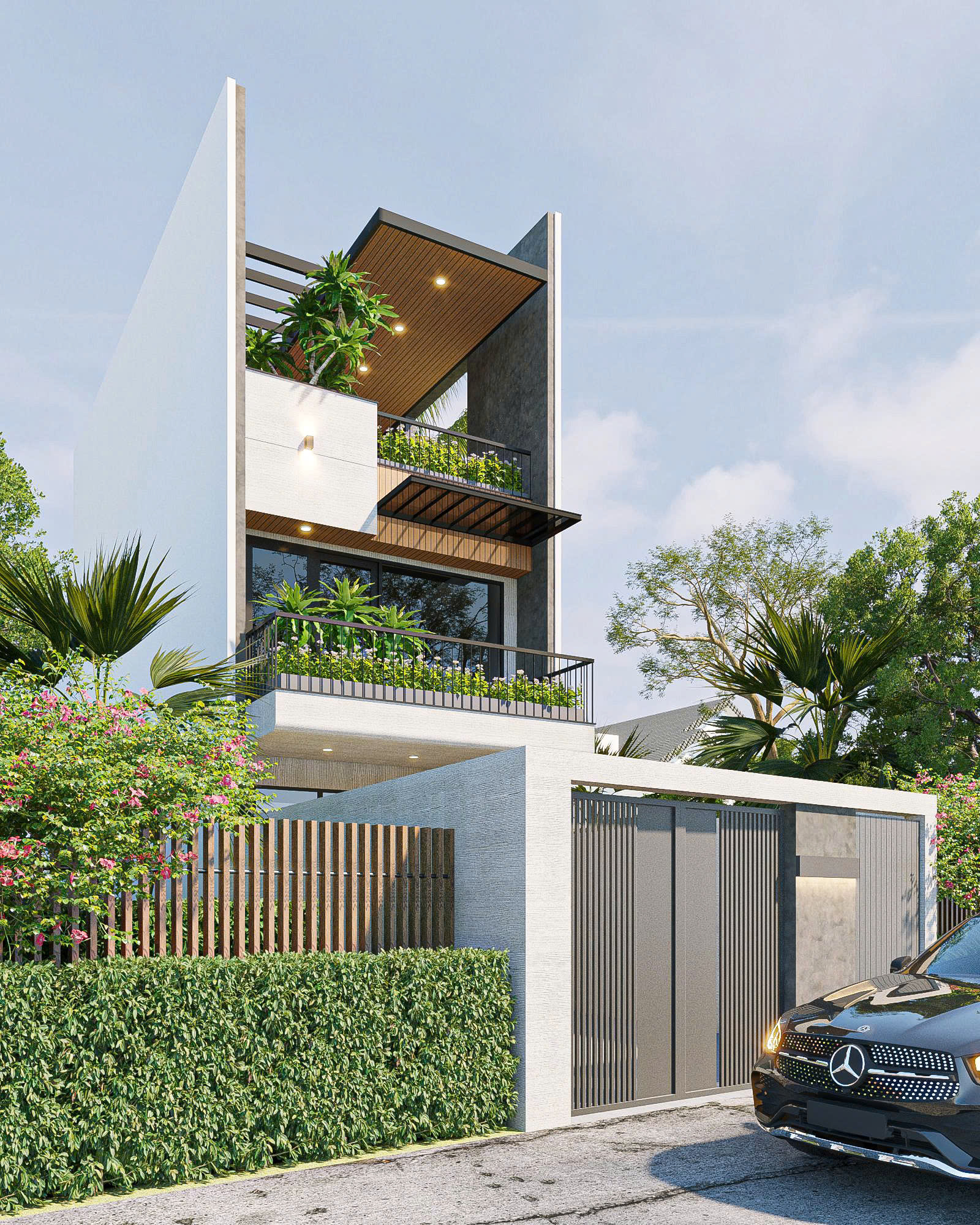 Green Balcony House là mẫu nhà phố hiện đại được thiết kế với định hướng mang thiên nhiên vào không gian sống đô thị. Công trình nổi bật bởi bố cục hình khối vươn cao, rõ ràng và mạch lạc, kết hợp cùng hệ ban công xanh trải dài theo từng tầng. Sự hài hòa giữa kiến trúc hiện đại và yếu tố thiên nhiên tạo nên một tổng thể thanh thoát, nhẹ nhàng nhưng vẫn rất ấn tượng.