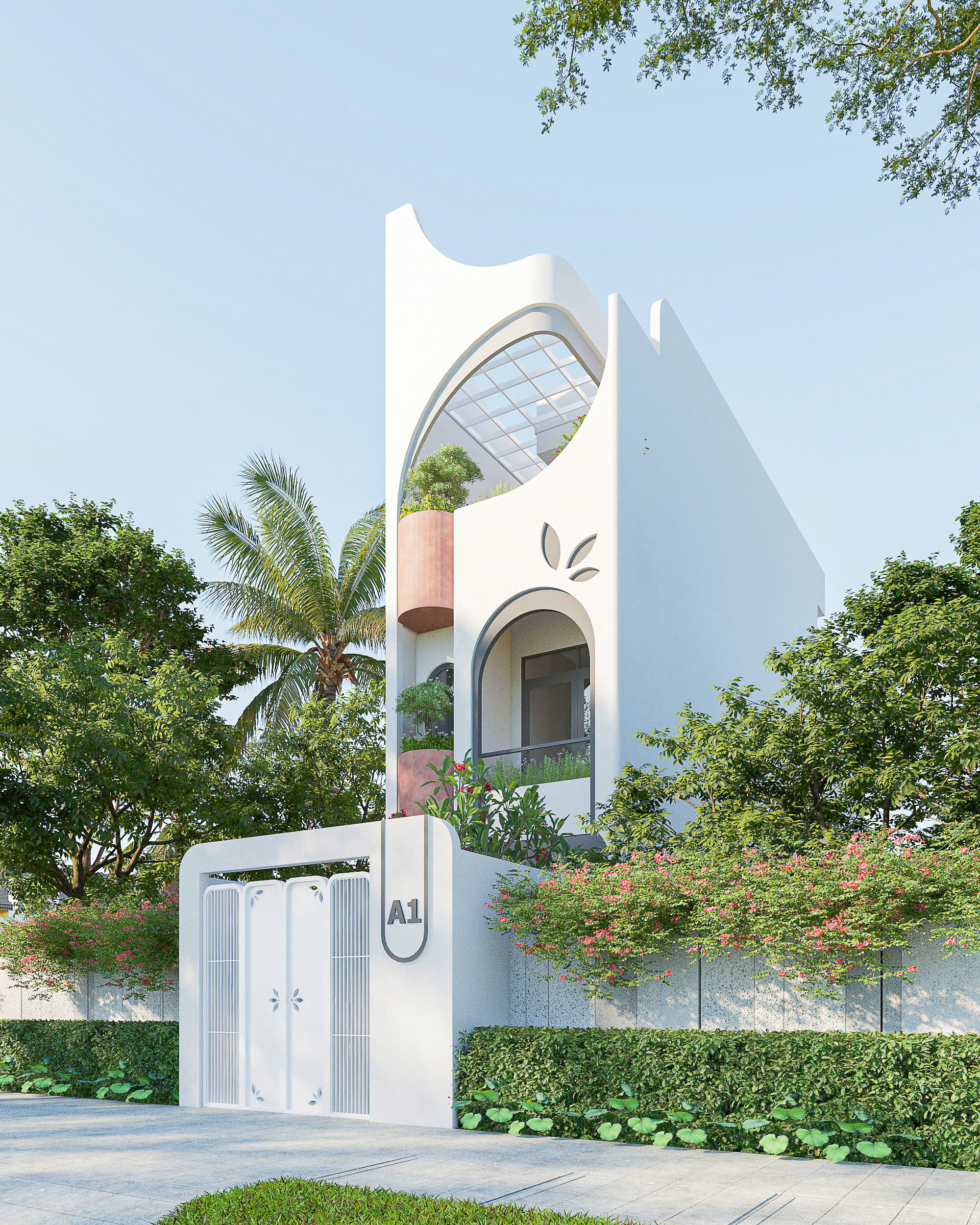 Cây xanh được bố trí xen kẽ ở ban công và sân trước, làm dịu tổng thể trắng – tạo cảm giác gần gũi, nghỉ dưỡng.