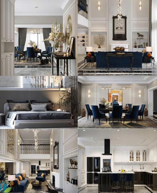• Nội thất sang trọng: sofa, bàn trà, đèn chùm, gam màu trung tính kết hợp điểm nhấn xanh navy hoặc vàng kim.