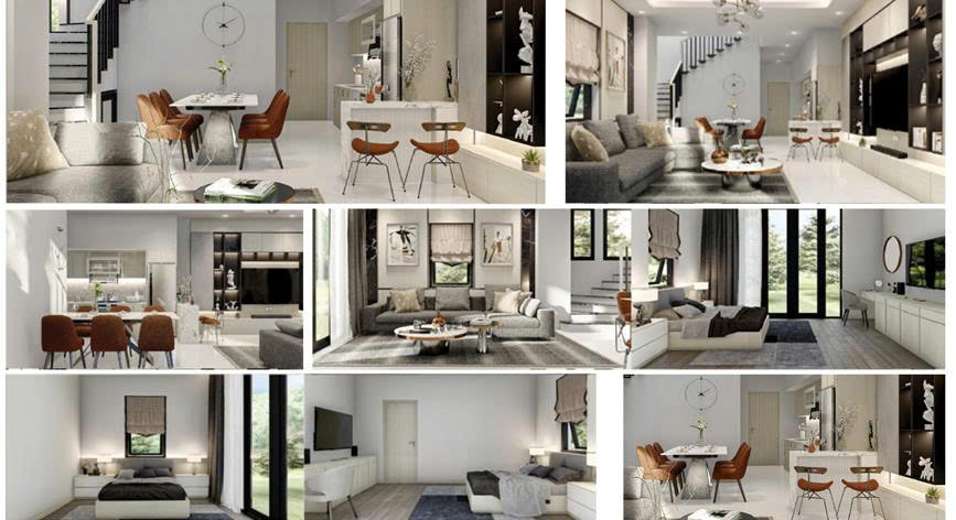 • Màu sắc chủ đạo: Trắng – xám kết hợp chi tiết kim loại và kính, nhấn mạnh sự sang trọng tối giản.