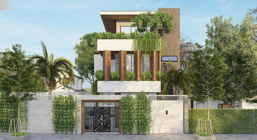 - Yếu tố xanh: Cây treo, tiểu cảnh và mảng xanh bao quanh giúp mặt đứng mềm mại, gần gũi thiên nhiên.