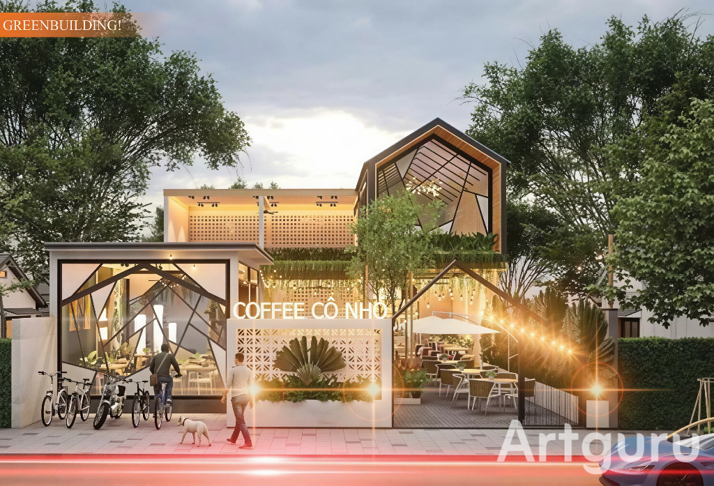 Thiết kế mặt đứng và bố cục của công trình quán cà phê này thể hiện rõ sự tinh tế và hiện đại, đồng thời gắn kết hài hòa với thiên nhiên và cảnh quan đô thị: