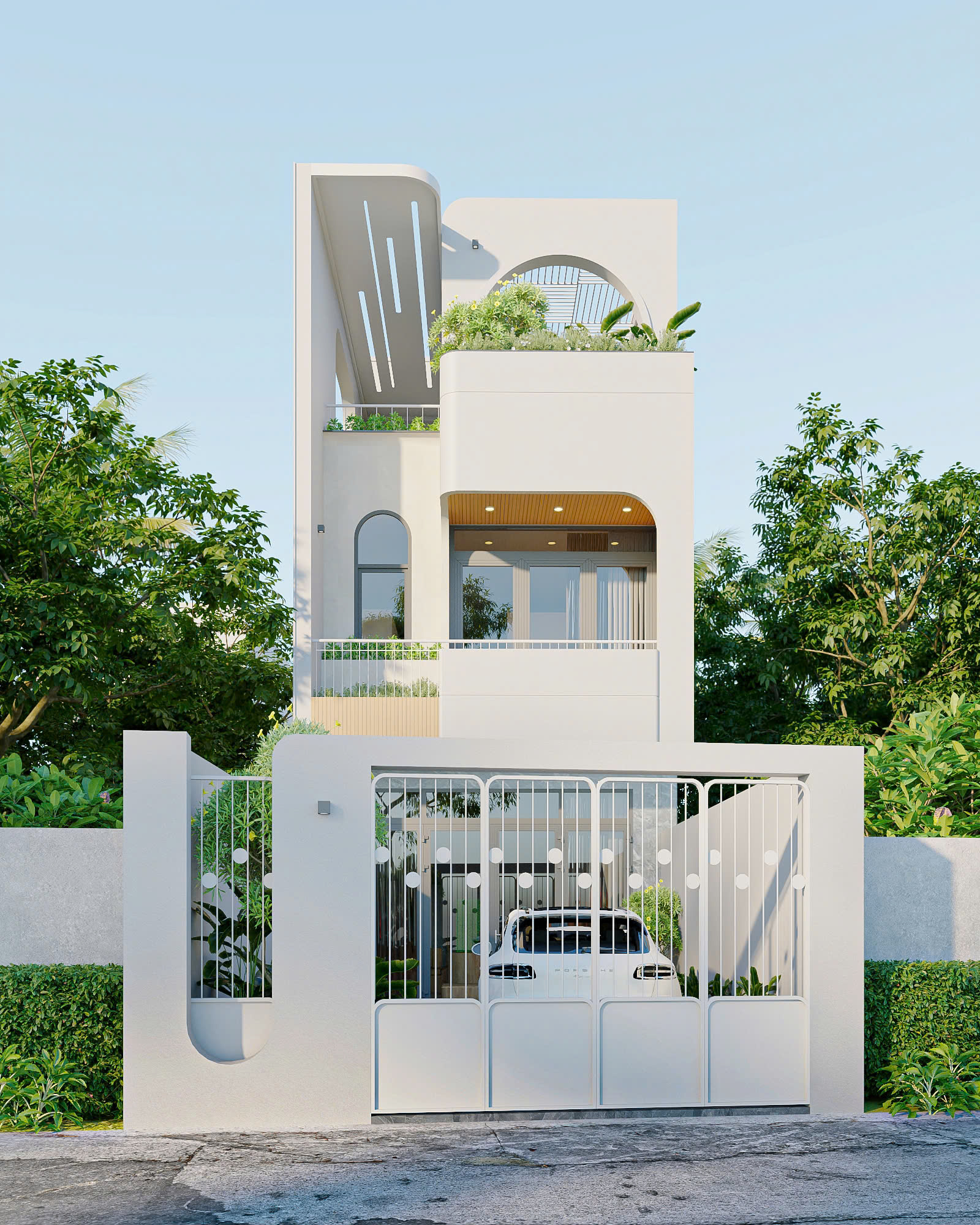 Phần tầng trệt được xử lý với hệ cổng kim loại sơn trắng mang phong cách tối giản nhưng vẫn đảm bảo độ thông thoáng và an toàn. Các chi tiết bo cong của cổng được thiết kế đồng bộ với ngôn ngữ kiến trúc chung của công trình, giúp tổng thể trở nên thống nhất và hài hòa hơn.
