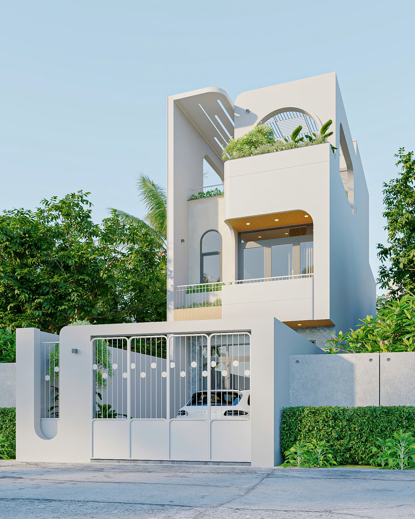 Serenity Arch House là một mẫu nhà phố hiện đại mang hơi hướng kiến trúc mềm mại, nơi những đường cong và hình vòm được sử dụng như ngôn ngữ thiết kế chủ đạo. Công trình nổi bật bởi sự kết hợp hài hòa giữa hình khối kiến trúc tinh giản, ánh sáng tự nhiên và hệ cây xanh được bố trí theo từng tầng, tạo nên một không gian sống nhẹ nhàng, thanh thoát giữa môi trường đô thị.